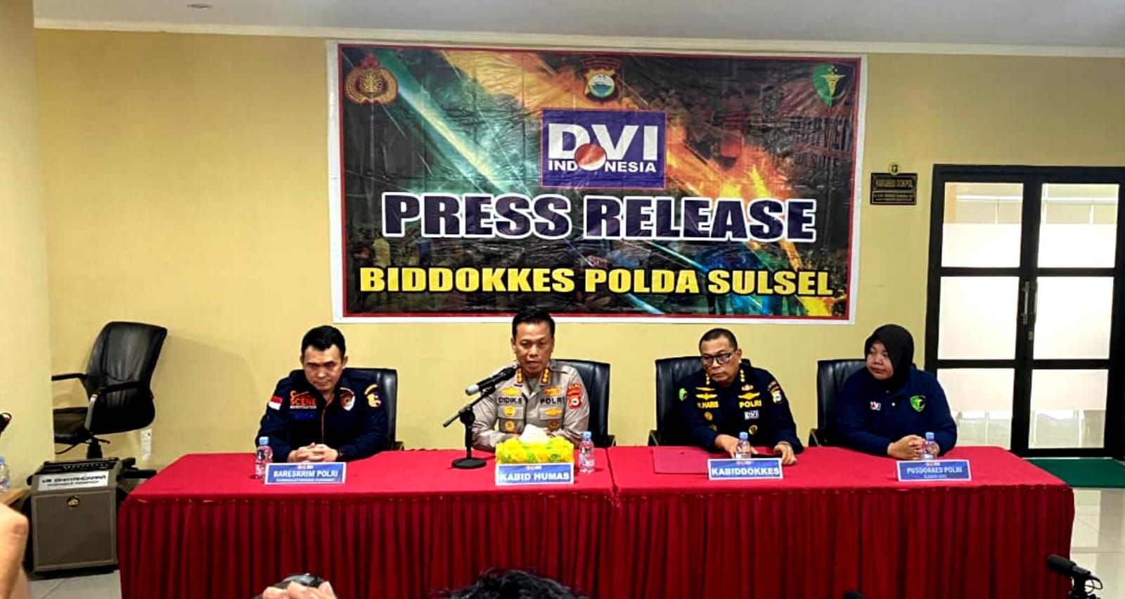 Konferensi Pers tersebut dipimpin langsung oleh Kabid Humas Polda Sulsel Kombes Pol. Didik Supranoto, S.I.K., M.H., didampingi Kabiddokkes Polda Sulsel, perwakilan Pusdokkes Polri selaku Kabid DVI, serta perwakilan Bareskrim Polri melalui Kabiddaktikkrim Pusident.