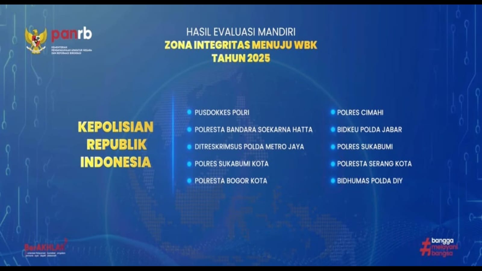 Sementara itu, sejumlah satuan kerja Polri lainnya juga mendapatkan predikat Zona Integritas Menuju WBK Tahun 2025, di antaranya Bidkeu Polda DIY, Jambi, Papua Barat, dan Jawa Barat.